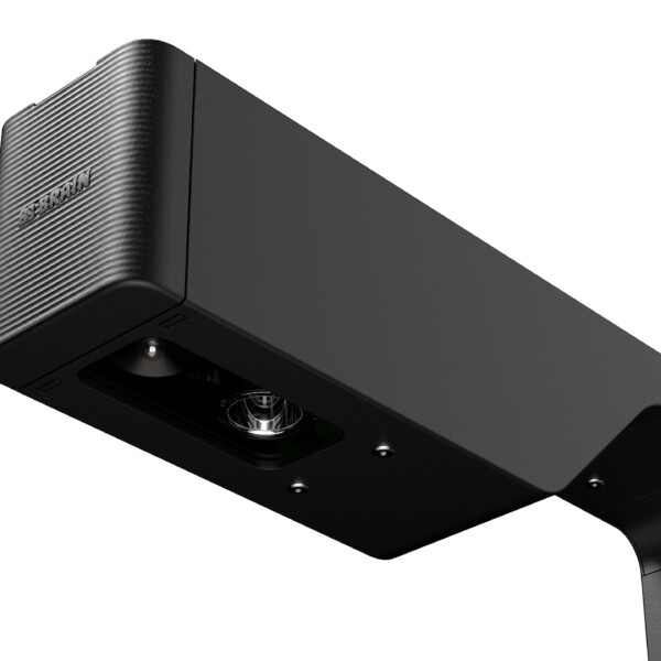 撮影部のヘッド形状をスタイリッシュに仕上げ、ベースから伸びたフラットなアームとの連続性にこだわったデザイン。ディテールでは、カメラヘッド先端の樹脂パーツに加飾を施し、ロゴをエンボス加工で表現することで、ブランディングの効果を狙った。